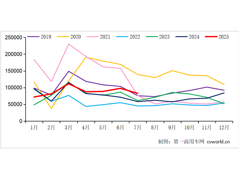 8.3萬輛放在最近八年來看,屬于第二高水平,只低于2020年7月的13.9萬輛,比其他年份的同月銷量都要高。累計來看,今年1-7月我國重卡市場銷量約為62.2萬輛,同比增長約11%。